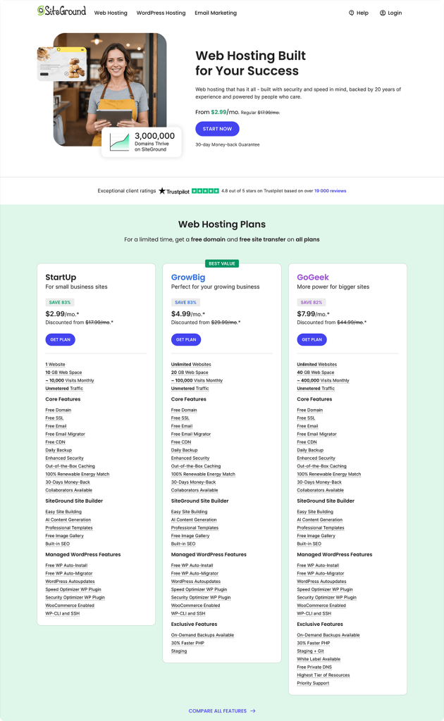 Siteground的三种主机方案旨在满足各种需求,从创建第一个网站的新手到运营大型电商网站的公司,再到为客户运营多个网站的代理机构和专业人士。