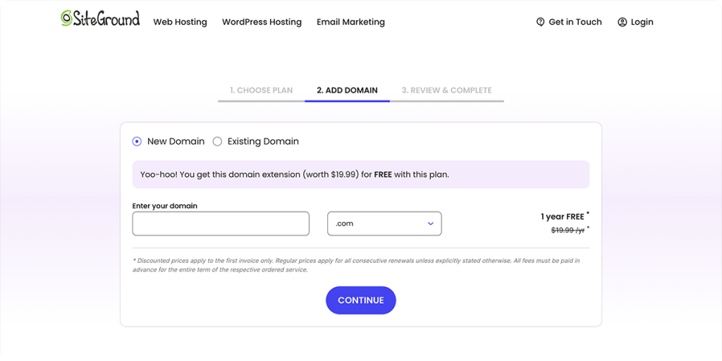 选定最符合自身需求的套餐后,即可注册域名,或直接输入想要使用的现有域名。Siteground为新域名提供优惠价格,新客户通常可以享受特别促销——首年免费顶级域名。