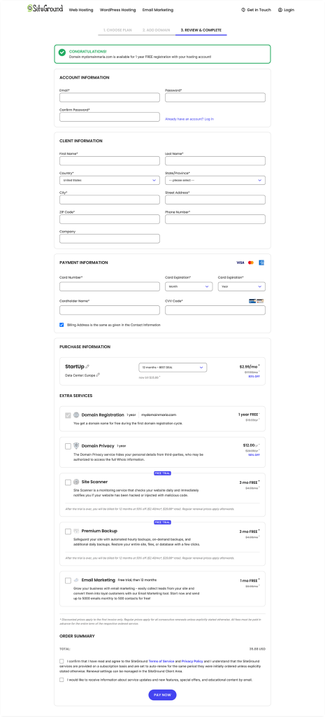 可以在这里查看套餐和域名信息,然后再完成购买。页面很简洁,只需输入账户和付款信息,可选择相关的附加服务。通常,订单页面上的附加服务会提供额外折扣,这是获取这些服务的最佳途径。